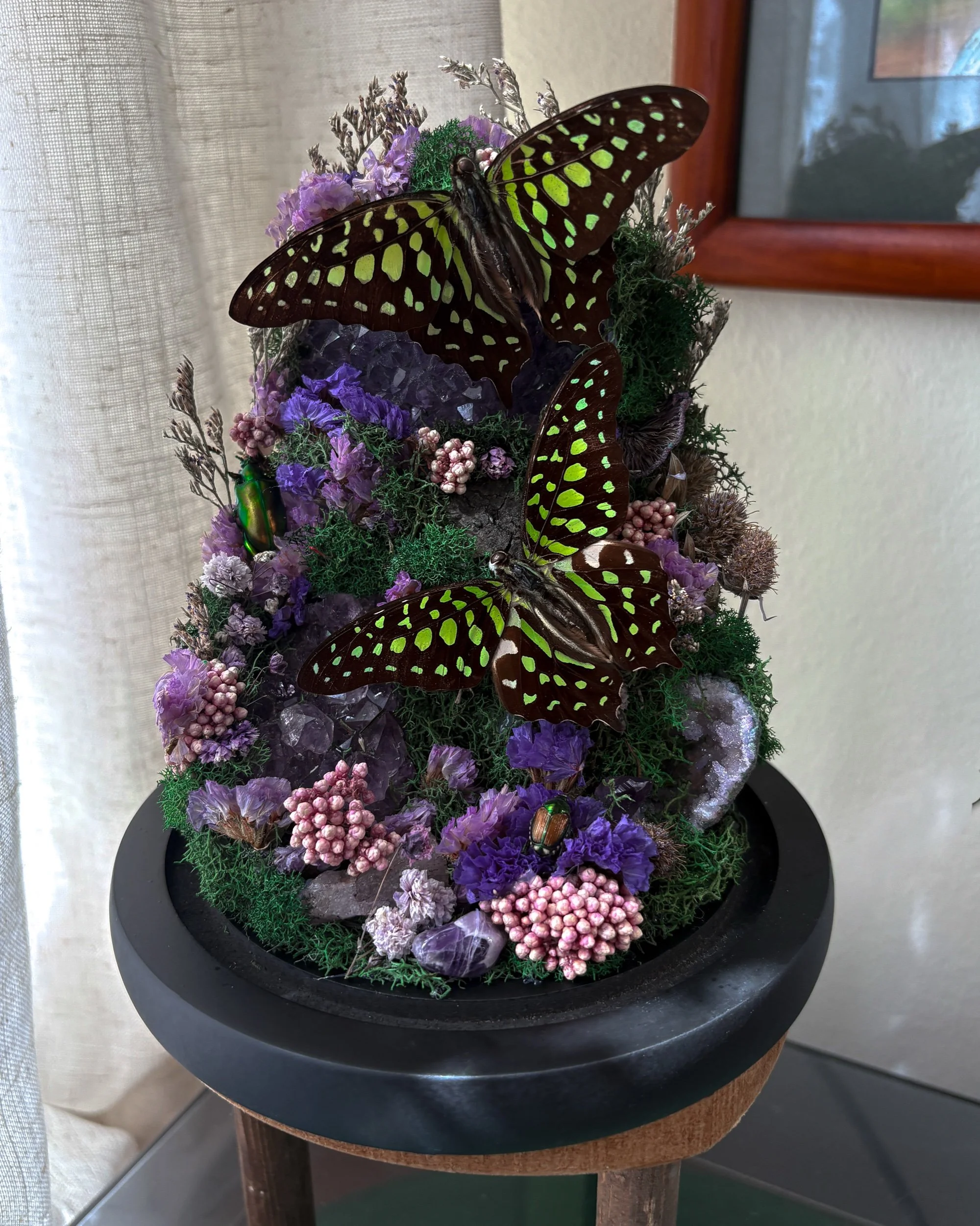 two huge amethyst clusters, foraged mushrooms, tumbled amethyst, geode chunks, green swallowtails, orange frog beetle, and a tiny little Japanese beetle. This piece was a massive undertaking and took over 12 hours to create, but I’m very proud of how it turned out :)
